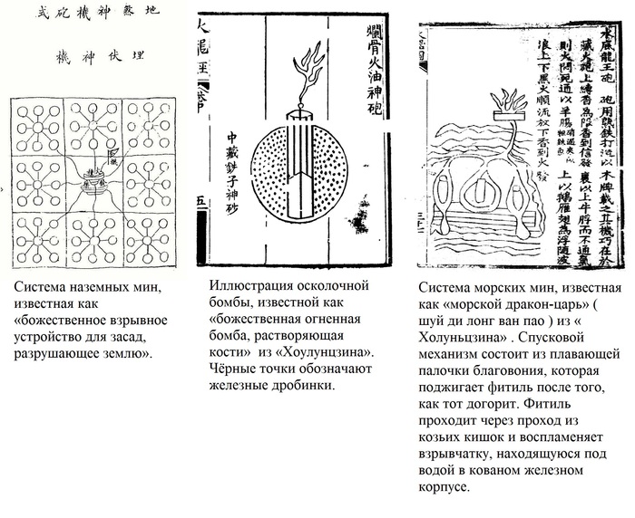 Помимо огнестрельного типа вооружения имелись много видов бомб, а также мин. Причем бомбы были начинены различными элементы для большего поражения, от черепков посуды до металлических осколков. Особо стоит отметить устройства мин. Наземные мины могли приводится в действие как вручную, так и самостоятельно. Ручные мины не редко имели каскадный тип, где один фитиль поджигал другие и это приводило к взрыву всех мин. А Самоподрывные мины оснащались стальными колёсами, помещёнными в два корпуса. При нажатии на колёса корпус должен высекать искру, которая достигает зарытых пороховых пакетов, вызывая взрыв. Помимо наземных мин, китайцы сумели создать устройства сложных подводных мин, которые могли сработать также каскадом.