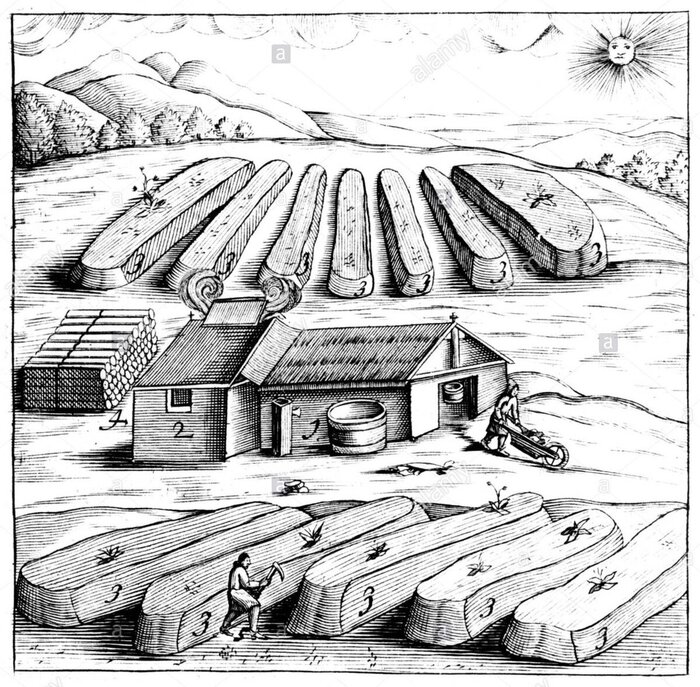 Средневековое селитряное производство. Отчётливо видны селитряные ямы, древесина для производства золы и поддержания процесса выпаривания. В центре у здания чан для набора чистой дождевой воды используемой при промывании заготовленной селитряной массы. Изображение из открытых источников.