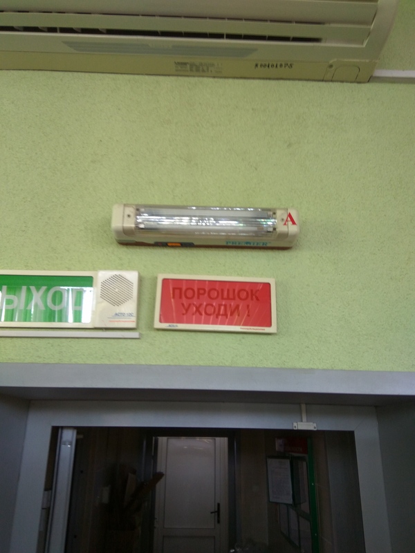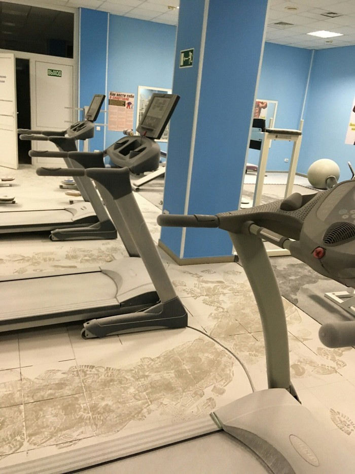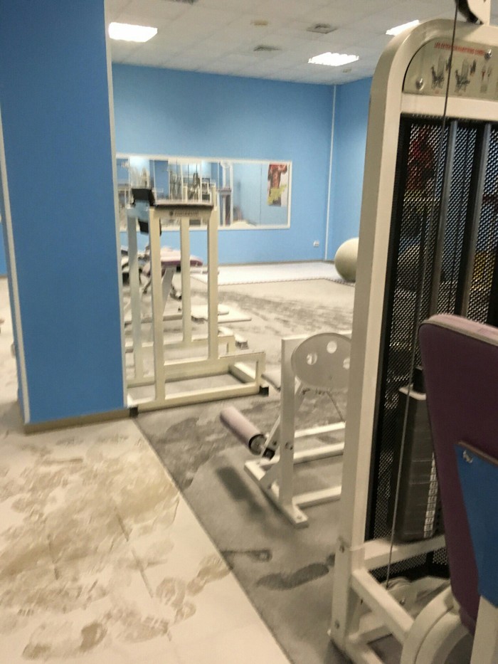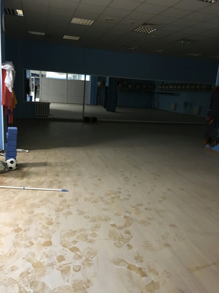 Спортивный зал занимает весь второй этаж в торговом центре. В рамках проверки пожарной безопасности, криворукий электрик-слаботочник полез в щит пож.автоматики и чего то там перепутал. Результат на лицо. Сработали распылители порошка, благо не во всем ТЦ и благо не все из имеющихся. Все произошло в 11 утра, в зале было всего пять человек. Клининговая компания, сутки все отмывала.