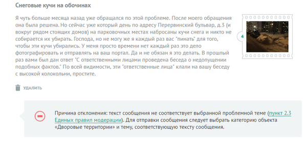 В общем-то это вся суть работы на портале, каждый день разные, но очень похожие обращения. Есть как и активные жители, а есть, те кому "Дома не сидиться". и фоткают каждую мелочь :) Но и модераторы "в городе", тоже не лыком шиты, не все пропускают.