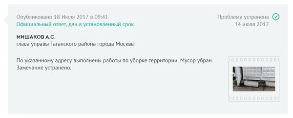 Я ее проверяю и отправляю в префектуру, там так же проверяют качество выполненой работы, и они отпраляют уже на город. На городе все проверяют и фото и текст ответа, подготавливают к публикации.