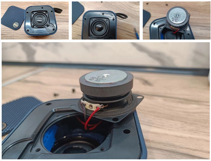 Давайте посмотрим, что у нас внутри. Колонка разбирается довольно просто. Для этого отщелкиваем переднюю пластиковую сетку. Она держится на обычных фиксаторах. Под ней можно увидеть активный динамик. Он удерживается на 4 винтах. Мощность динамика 5 Вт, как и заявлено производителем. Подвес резиновый, а сам динамик построен на ферритовом магните. Ход довольно большой для такой мощности.