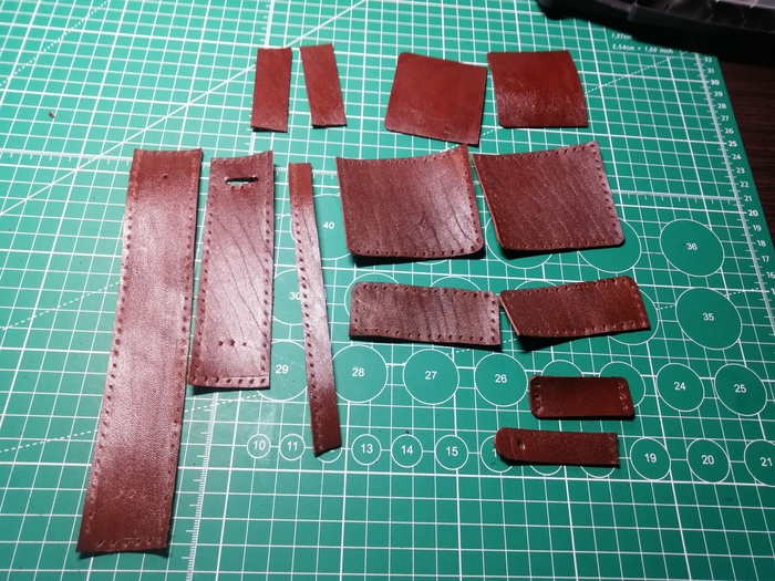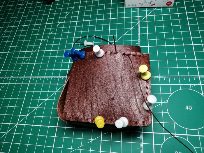 Пытался выдержать брутальный фасон: матовое покрытие, не сглаженные кромки, классический цвет. С прошиванием намучился, донышко и верхняя часть сшиваются с изгибом, кожу ведёт - потому геометрия изделия не идеальна. Но, в чем то это добавляет самобытности и "дикости" изделию. По швам тоже есть пара ошибок.