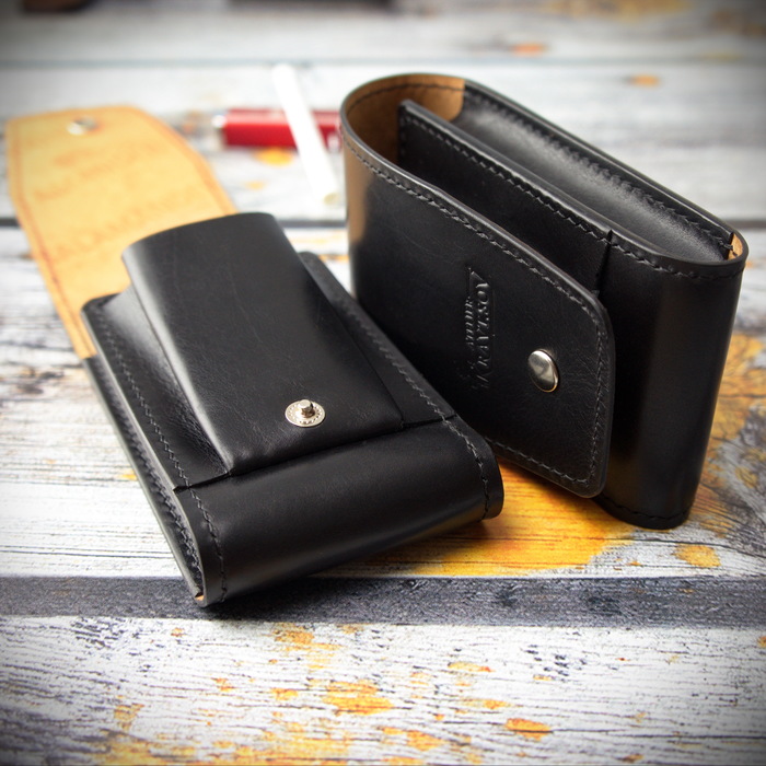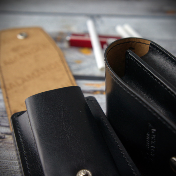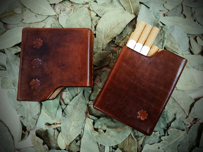 Портсигар изготовлен из дубленой кожи вручную: окрашен (оформлен в стиле «millésime clair»), пропитан водозащитной аппретурой, сшит крепким седельным швом. Футляр рассчитан на 20 сигарет длиной 77 мм - 83 мм (3 дюйма - 3,3 дюйма).
