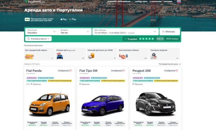Localrent — мой главный фаворит для Португалии, когда хочется «по-честному и без лишних нервов». Суть сервиса проста: он агрегирует местные прокаты, приводя их условия к понятному формату. Почему это важно? Локальные провайдеры часто дают лучшие цены и опции без депозита или с залогом «символического размера», но искать их по отдельности — то еще квест. Localrent сокращает путь от желания до ключей, не превращая бронирование в юридический кроссворд.