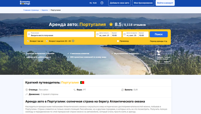 EconomyBookings — еще один крупный международный агрегатор с акцентом на гибкие страховые пакеты и широкое покрытие по Португалии. Часто именно здесь удается найти хорошую цену на середину и высокий сезон благодаря партнерским спецпредложениям. Важный момент — понятная структура тарифов и удобные фильтры по депозиту, франшизе, типу оплаты и месту выдачи.