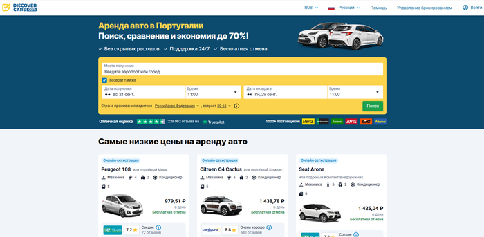 DiscoverCars — один из крупнейших глобальных агрегаторов, который тянет цены и условия сразу от множества международных брендов и крупных локальных сетей. Сервис полезен, когда хочется не «вылавливать удачу», а сравнить широкий срез рынка за минуту, особенно по аэропортам: Лиссабон, Порту, Фару, Мадейра, Азоры. Логика простая: вы выставляете фильтры по депозиту, страхованию, топливной политике — и видите, где действительно выгодная итоговая стоимость, а не только «красивая цена за сутки».