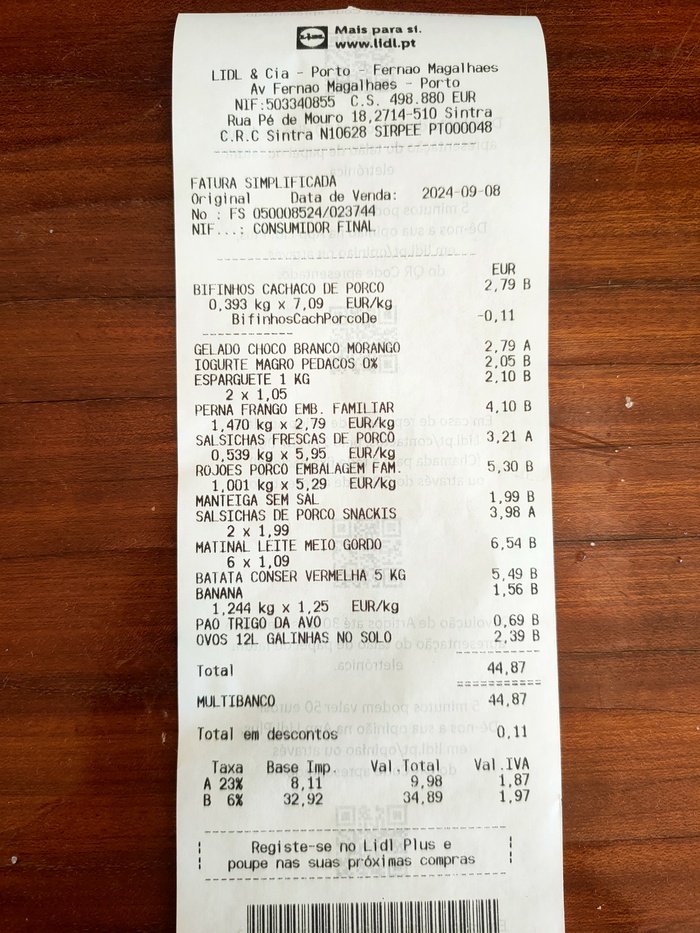 Доброго всем. И так, продолжаю отвечать на вопросы про жизнь на краю света, а именно в Португалии. Сегодня была небольшая закупка продуктов. Это не рацион на неделю. Это примерно то что берём в выходные. Остальное покупаем по мере необходимости. Магазин у меня за углом дома, там и все покупаю. На фотографии я обозначил все цены на сегодняшний день. Все продукты хорошего качества, это сетевой маркет, очень популярный не только в Португалии. Общая стоимость покупок составила 44.87€.