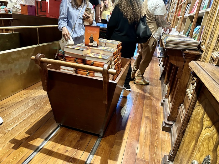 - Ну и есть конечно история связанная с Джей Кей Роулинг (именно так её называют, не как у нас по полному имени - Джоан Роулинг, а как американского президента Кеннеди - Джей Эф Кей). Её муж, я не знаю, сейчас ли он ещё не муж или нет, но имя кажется было похоже на Вольдеморт, можете судить, был из Португалии и она сама была в Порту. Говорят, что весь стиль Гарри Поттера навеян архитектурой Порту, вы видите, и лестницы красивые и прочее. А форма студентов Порту похожа на форму школы Хогвартс. Ходили слухи, что и наш магазин она посещала и тут родилась идея о Гарри Поттере. Но в 2020 году она сама это опровергла. Я не знаю, правда это всё или нет, но мы не любим эту взаимосвязь, она как бы затмевает всю историю и книжный мир магазина. Но мы сохранили маленький уголок с книгами о Гарри Поттере, даже тележку ими наполнили.
