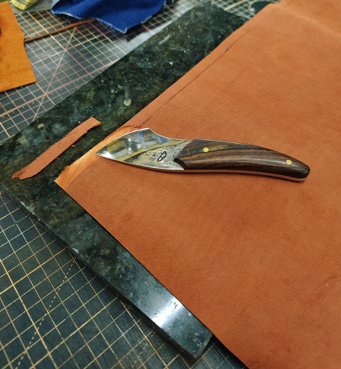 Так вот, делается он из тонкой полоски кожи, я брал с небольшим запасом по ширине, чтобы лишнее срезать после сшивания.