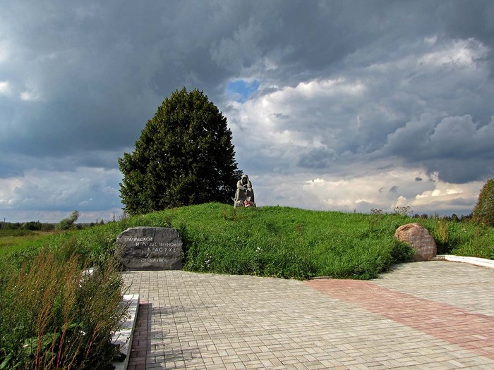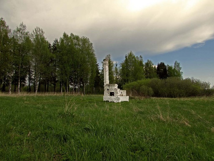 Кроме трагичной скульптуры и обелиска, поодаль в траве стоит русская печь, добавляющая месту еще большей драматичности.
