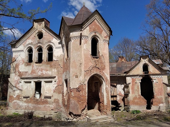 На фото внизу - дом графини. До сих пор невооруженным глазом видно, что архитектура была шедевральна. Часть построек уже рухнула полностью, часть еще держится. Среди руин есть останки церкви Всемилостливого Спаса. Постирония во всей красе.