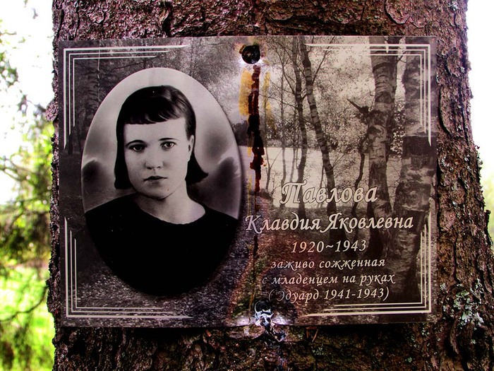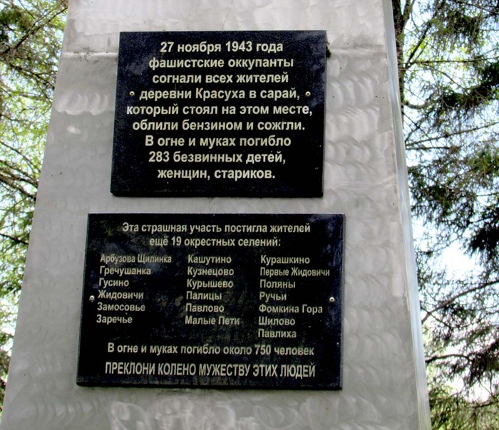 Сразу после освобождения составлялись акты о зверствах и злодеяниях немецко-фашистских захватчиков. В таком документе, составленном в мае 1944 года приводится цифра, основанная на колхозных списках – 270 человек. Позднее были установлены имена еще 13 человек. В живых остался только один свидетель – жительница деревни Красуха Мария Лукинична Павлова (абзац процитирован с краеведческого сайта pskoviana.ru). На фото выше видно, что сруб за обелиском символизирует тот самый сарай.