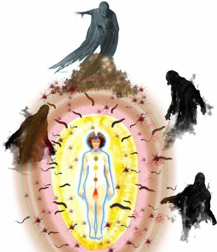 - Сидите, я посмотрю, наверное что-то упало- сказал Валера направляясь туда. Судя по звукам в комнате кто-то усердно копошился. Вид у Валеры был спокойный, но внутри невольно всколыхнулся древнейший человеческий ужас перед сверхъестественным. Медленно пройдя маленький коридор, он осторожно отодвинул занавеску которая скрывала покойницу... Бросок был моментальный. Валерий не успел ничего понять как его шейные сосуды были разорваны зубами мертвой бабули. Кровь рекой потекла в сморщенный старушечий рот. Зловонная пасть мертвячки жадно чавкала заливаясь горячей артериальной кровью, издавая булькающие звуки. От обильной кровопотери Валерию стало трудно дышать и закатив глаза он отправился в вечную тьму. За спиной раздался визг Вики и плачь Ани. Эти крики отвлекли монстра от кровавого пиршества, он резко повернул свое безобразное, почерневшее, похожее на сморщенный изюм рыло и отшвырнув труп Валеры одним прыжком преодолел расстояние разделяющее их с Викой. Девушку буквально парализовало от ужаса, она даже не смогла развернуться, все на что у нее хватило силы это выставить перед собой руку для укуса. Бабушка сильно преобразилась, глаза стали стеклянными и пустыми, как и подобает покойнику, но от них исходило болезненно-белое потустороннее сияние, наполненное ненавистью ко всему что еще не утратило возможность дышать. Лицо упокоенной сморщилось приняв темный оттенок, половина лица было заляпано валериной кровью, которая стекая широким ручьем по одежде придавала этому существу особенно ужасающий вид. То что было в прошлом сгнившими и расшатанными зубами старой женщины превратилось в острые, желтые клыки хищника, предназначенные для разрывания мяса. Два клыка выступали над нижней губой, а два торчали под верхней. Именно эти смертоносные кинжалы вгрызлись в викино предплечье вырывая куски плоти и чуть ли не обгладывая руку за считанные секунды. Из пасти разъяренного демона доносился утробный рык взбесившегося зверя оказавшегося на кровавой трапезе среди беззащитных жертв. От безумной боли Вика начала терять сознание и уже особо не сопротивлялась когда острые как иглы жвала глубоко погрузились в ее шею... Пока монстр был занят нападением на Вику, с пола поднялся Валера с разорванным горлом, сияющими мертвым светом очами и огромными клыками торчащими изо рта. Потерявшие сознание мать и дочь были для него совсем легкой добычей. Он с утробным рыком бросился поедать Аню быстро работая челюстью он вырывал огромные куски из тела дочери и проглатывал их, попутно орошаясь потоками горячей и дымящейся крови, затем откусил носовой хрящ вместе с верхней губой и начал выедать глаза словно стервятник. Покончив с девочкой, монстры принялись за совместное пожирание Натальи Ивановной...