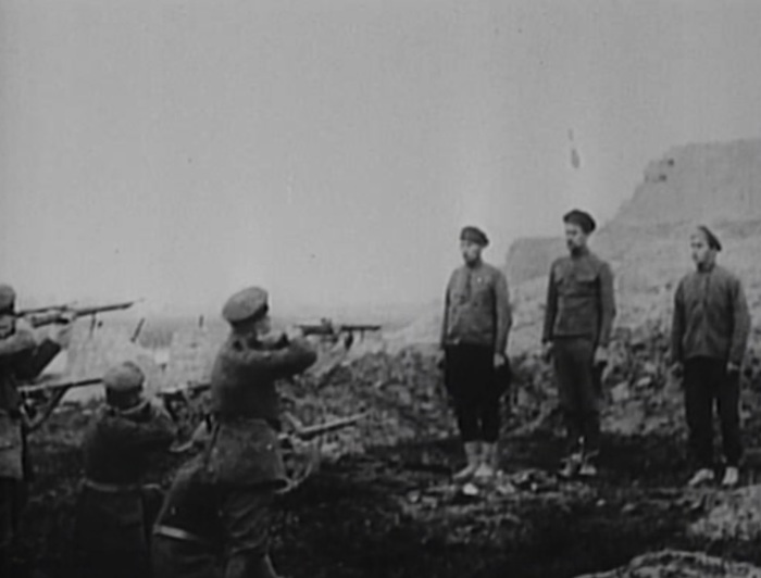 На самом деле на кадрах хроники запечатлен расстрел латышских коммунистов белогвардейцами в 1919 году.