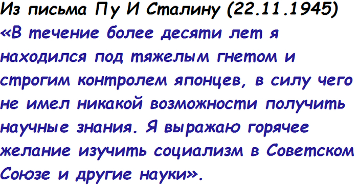 Понимая, что после того как его интернируют после суда в Китай, а Мао Цзэдун с ним церемониться не станет, Пу И в отчаянье пишет письмо Сталину: