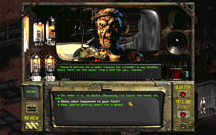 По иронии судьбы, именно здесь находился тот самый водный чип, ради которого Выходец из Убежища (мы) покидает родные стены в первом Fallout. Черный юмор этой ситуации - система очистки воды была настолько хороша, что работала десятилетиями, поддерживая жизнь в городе мутантов. Забирая чип, мы как бы спасаем свое Убежище 13, но обрекаем весь Некрополь, на медленную и мучительную смерть от жажды.