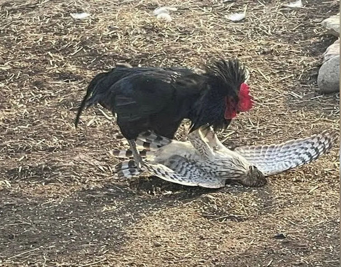 Если петух вовремя заметил хищника и успел на него броситься, то курицу он отобьёт точно. Уцелеет ли сам? Скорее всего – да. Обычно хищники, встречая активное сопротивление, стараются просто убраться восвояси, потому что если придется драться с петухом, то драка эта будет происходить на земле, где петух чувствует себя увереннее, чем летающая птица.