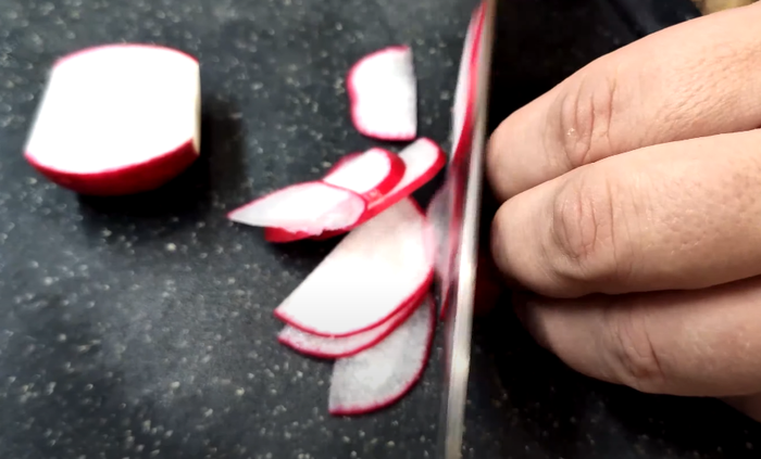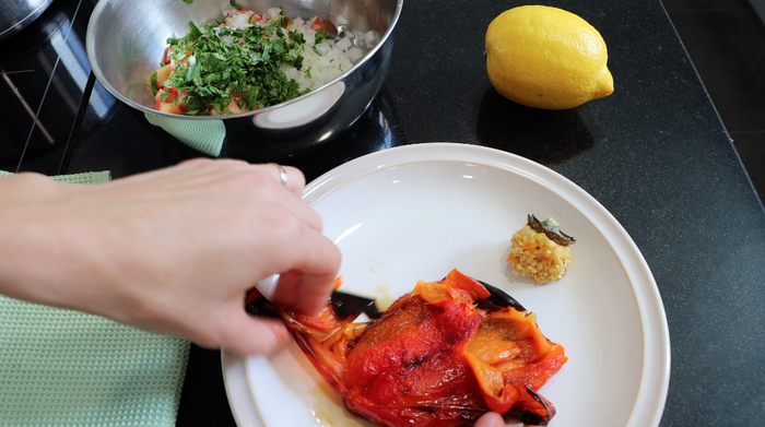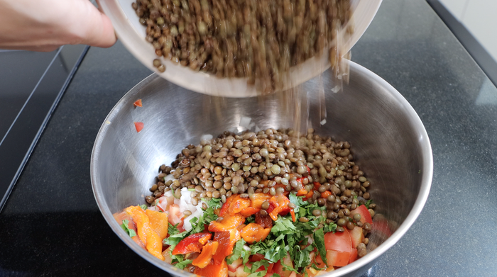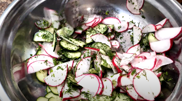 Для заправки смешиваем растительное масло, уксус, лимонный сок, молотый перец и перемешиваем.
