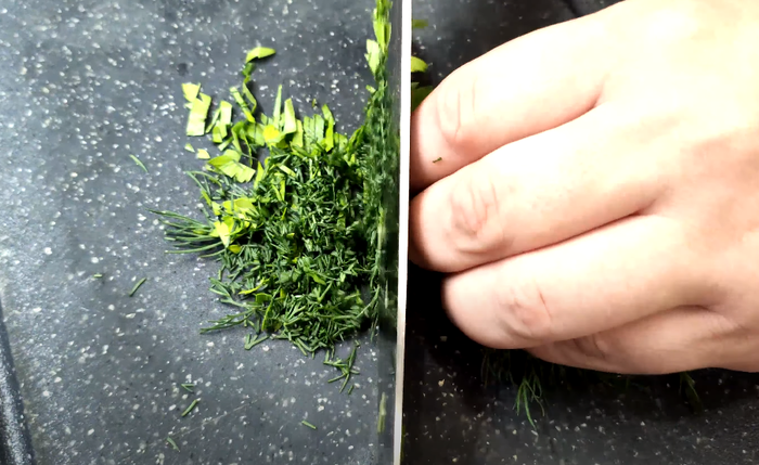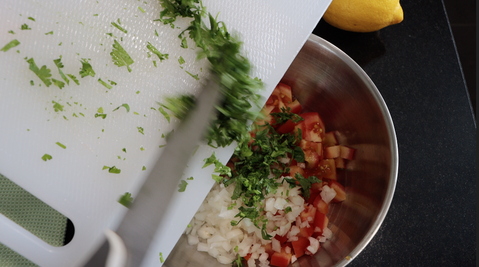 Нарезаем томаты. Нарезаем и вынимаем мякоть авокадо, также нарезаем сельдерей и оливки. Все ингредиенты кладем в миску, подсаливаем и перемешиваем. Добавляем мелко нарезанную зелень.