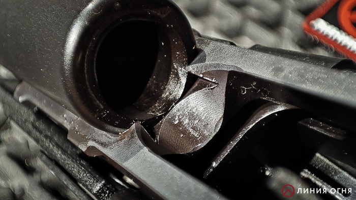 Горка ствола Grand Power T-12 FM2, 2024 г.в. - это то место, где патрон, досылаясь из магазина, сначала контактирует с рамкой-вкладышем, а затем помещается в патронник. По опыту можно сказать, что встречались экземпляры, на которых патронник немного выступал над вкладышем-рамкой и по этой причине происходило утыкание патрона в край патронника. Такие моменты встречались крайне редко и также решались в ближайшей оружейной мастерской.