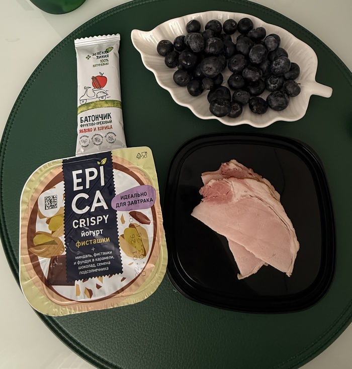 На завтрак была лакшери коробочка голубики на 125 грамм,честно даже легкую вину чувствую когда ем такие безбожно дорогие продукты:D батончик из перека очень понравился-со вкусом яблока,корички и орехов,нежный. Йогурт тоже интересный,этот вкус эпики я еще не пробовала. Написано крупными буквами фисташки,и я почему-то ожидала орехи,а это вкус йогурта и насыпали семечек подсолнечника+крошку шоколада:D еще грудинки остатки доела,это было ошибкой. Без хлеба тяжко,это не ветчина