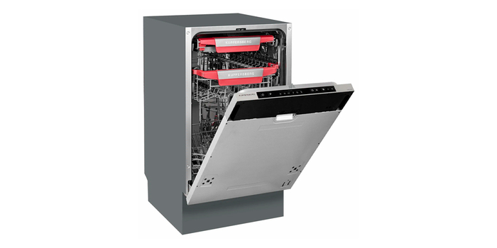 На втором месте рейтинга стоит встраиваемая узкая посудомоечная машина Kuppersberg GSM 4574 с полной защитой от протечек Aqua-Stop, тремя разбрызгивателями и загрузкой до 10 комплектов посуды. Внутри установлены две основные эргономичные корзины со складными держателями и полочками и узкая верхняя корзинка для столовых приборов, которая имеет складную конструкцию с изменяемой геометрией. Благодаря этому, а также возможности изменения высоты средней корзины, можно размещать любую по габаритам посуду.