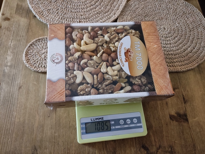Спустя минут 20-30 всё было отсортировано. Оплата продуктом по факту выполнения задания, после взвешивания. Пока освободилась коробка, взвесим её. Мусора от орех практически не было, так, пыль.