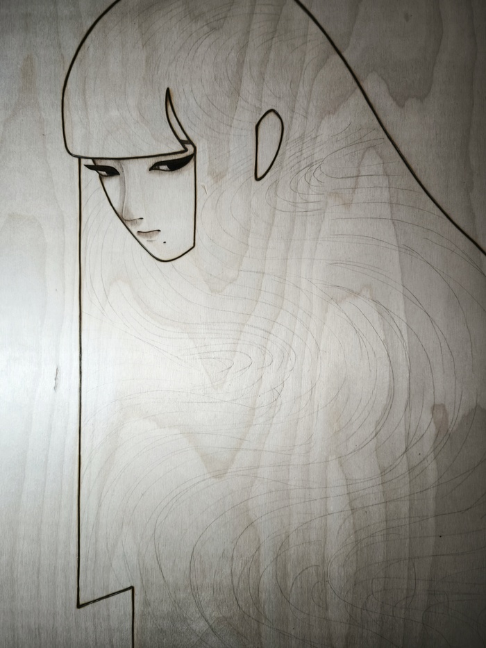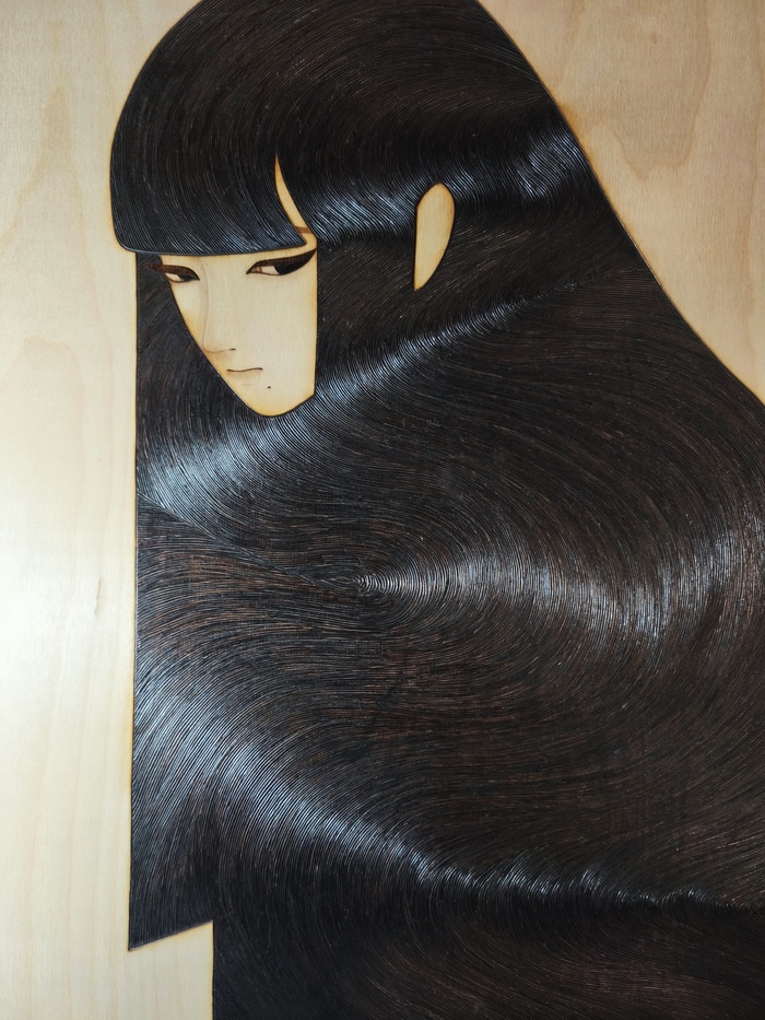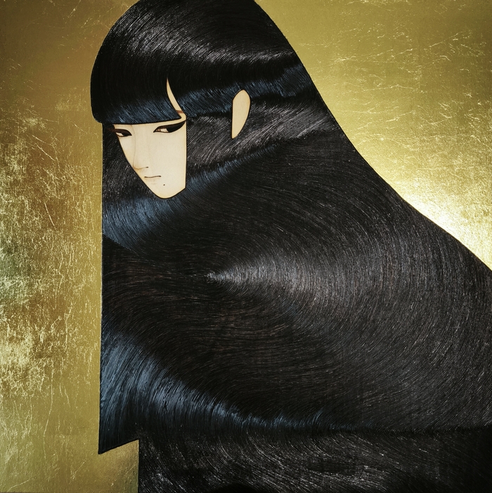 Картина по мотивам одной из работ Yamanaka Tomoro. В оригинале фактура волос делалась огромной кистью в одно движение, у меня же на повторение похожего эффекта ушли долгие часы работы.
