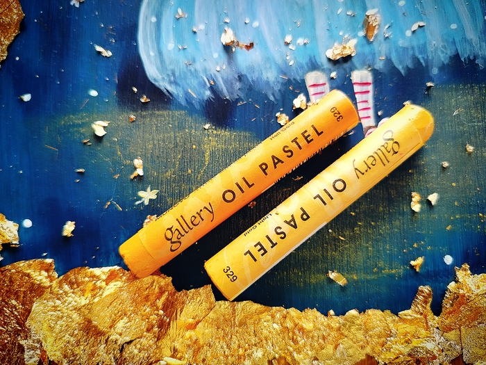 И, наконец, мелки золотые отлично подходят для декора готового фона, для прорисовки, например, отдельных травинок или для тонировки частей рисунка.