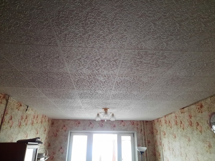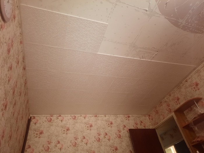 Я не специалист по потолочкам, клеил их в этот раз второй раз в жизни. За основу взял левый, дальний угол, чтоб с двери, как заходишь, был самый ровный вид из целых листов. Даже с порога, чтоб виднелось "красота". Идея клеить потолочку по диагонали, отпала сразу, потому, что, повторюсь, ремонт нужен был вчера.