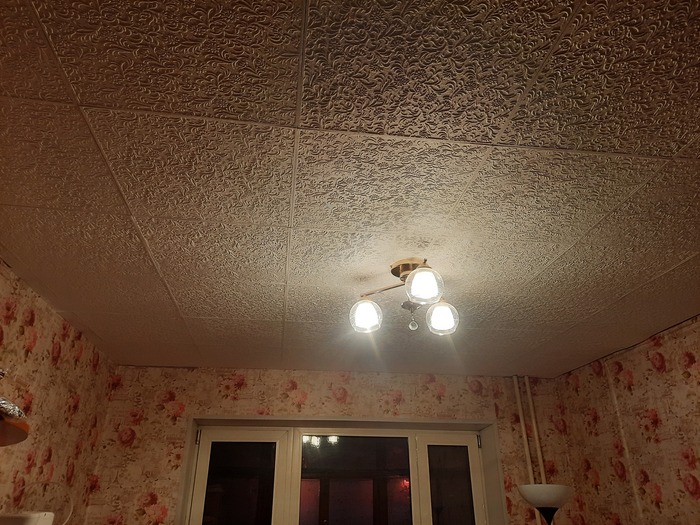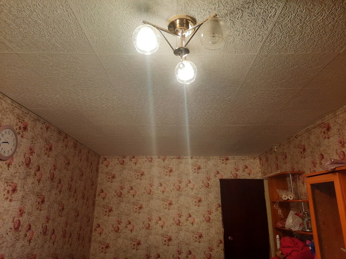 Люстра, новая, её тоже перевешивал сам, сбил какую - то кругляшку, которая не давала повесить люстру плотно, с проводами мрак, наращивал клемниками. Лампы пока простые.