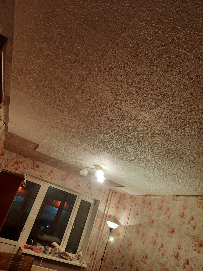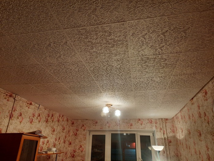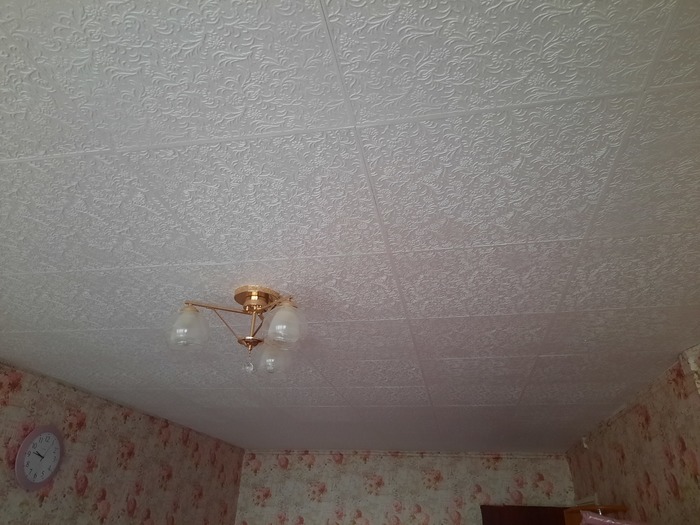 На пол потолка хватило Титана, на следующий день, купили Сафит, в двое дешевле, эффект тот же. За клеем пришлось ехать, здесь везде надо ехать, сбегать в магаз, не вариант. Мне и самому, надо пару часов добираться к ним из своего дома.