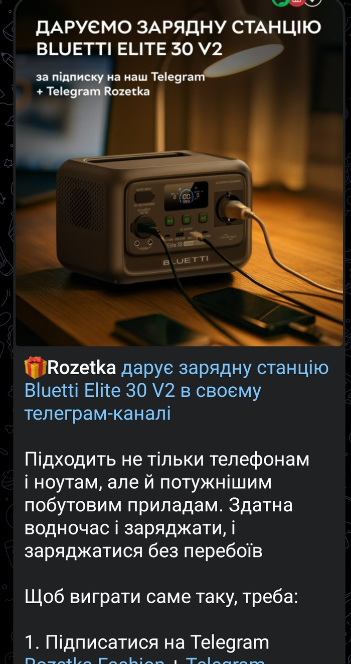 Ничего необычного, просто на одном из украинских тг каналов разыгрывают зарядную станцию, после очередного отключения электричества.
