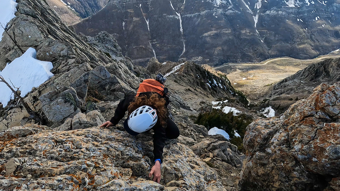 Маршрут по большей части был траверсный: то поворачивал налево, то направо. Следующие три питча были достаточно легкими (если не смотреть вниз).