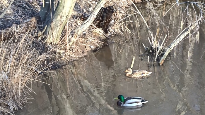 Чёрная кошка (кот) cама грация и походка пантеры (на берегу реки), рядом на воде уточка и селезень. Фото + Видео. Берег реки Оккервиль, Санкт-Петербург. Весна 2021.