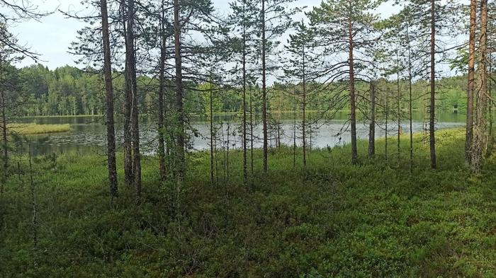 Немного не доехав до намеченной на карте речушки, вижу недалеко от трассы, поблёскивающую сквозь сосны, гладь небольшого озера с болотистыми берегами. Дороги туда нет, но нам это даже на руку, никто не заедет на машине. Сходив на разведку, нашёл и подходящую для палатки полянку на мягком мху.