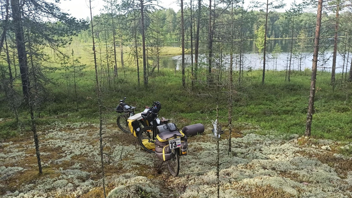 День 37 (Республика Карелия). Утро проходит по начавшему формироваться новому сценарию. Раз напасть в виде слепней надолго, приходится как-то с этим сосуществовать. Выходя из палатки, обливаешься химией и начинаешь заниматься утренними делами. Эффект не сто процентный и действует не бесконечно, но это позволяет противостоять заразе. Несмотря на близость водоёма и идеальные условия для водных процедур, теплая и чистая вода, жаркий день, хороший берег и дно, в воду лезть лучше не стоит. Мокрое голое тело, без следов репеллента, вызывает у крылатых тварей массовый психоз и нездоровую активность. Купание откладывается на самый последний момент, когда всё упаковано, сумки навешены, осталось лишь натянуть велоформу, впрыгнуть в кроссовки и дать дëру с места стоянки, резво заработав педалями.