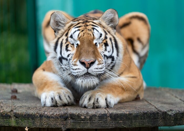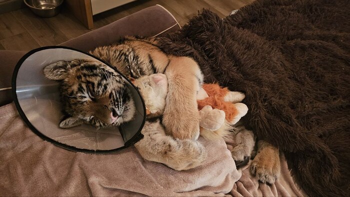 Каталина с пришитой лапой. Сейчас она уже взрослая, живет в вольере с друзьями и наслаждается полноценной тигриной жизнью.👇