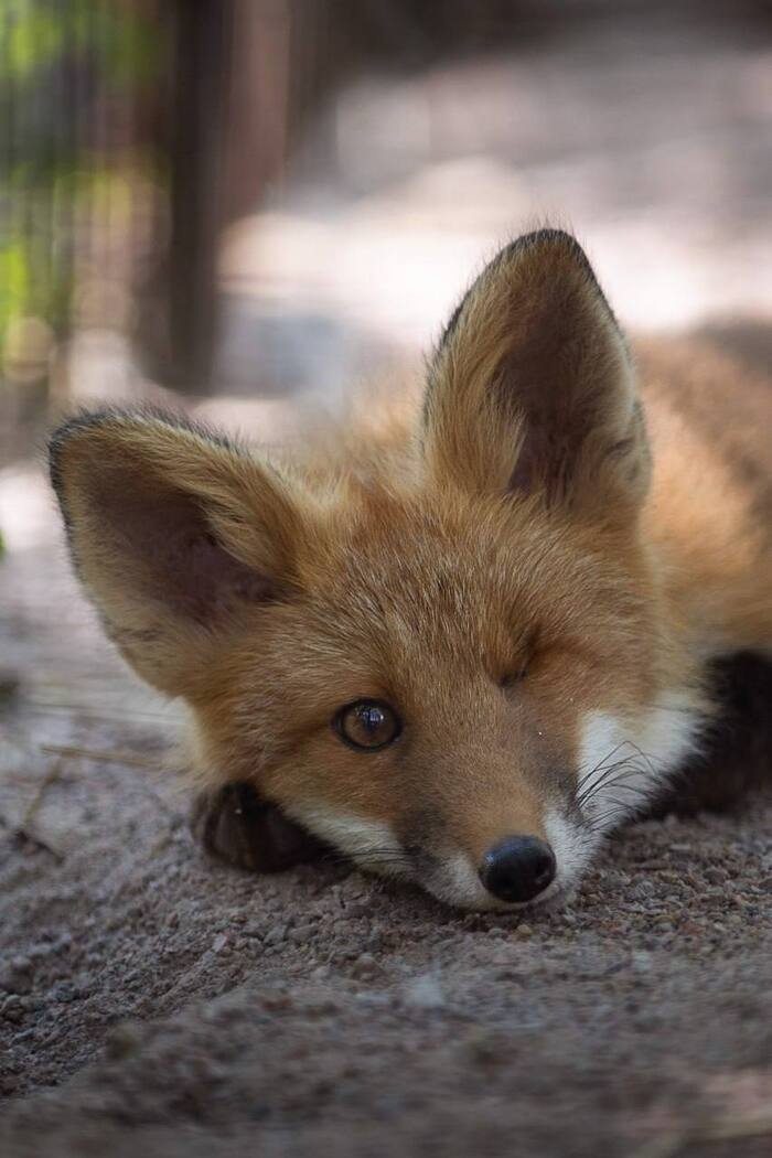 Лисё. Принесли соседи, подобравшие лисенка с прокушенной головой. Лисё после травмы плохо видит, совсем не слышит, развилась эпилепсия. Принимает таблетки, дружит с собаками, радует людей 👇