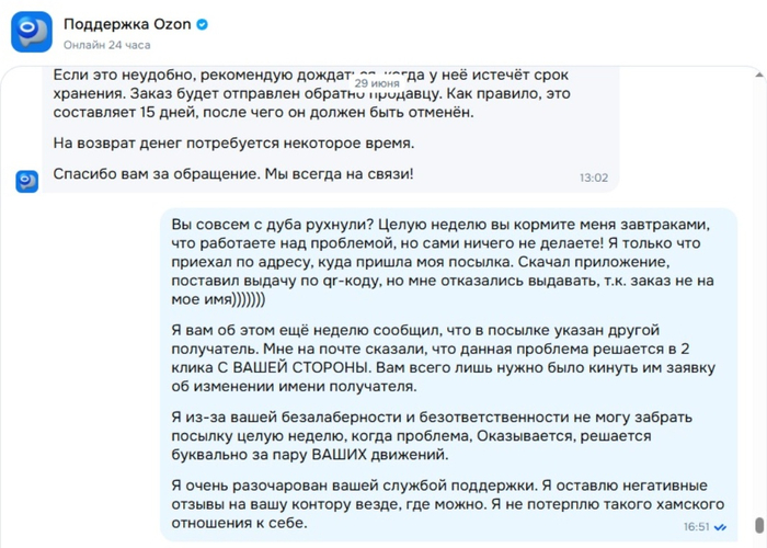 Продавец так и не ответил, поэтому решил напомнить службе поддержки озон о проблеме.
