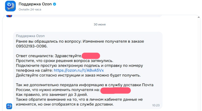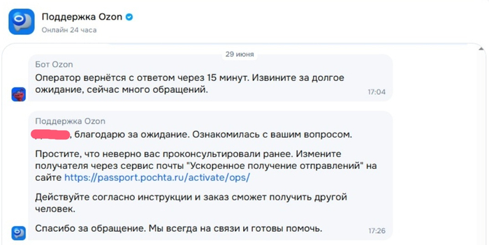 Здорово, правда? Я отстоял время в очереди на почте. Я показал нашу переписку сотруднику. Та очень удивилась ответу поддержки, ведь, оказывается, данная проблема - не редкость. Она очень легко исправляется отправлением заявления от самой поддержки озон. Почему служба поддержки знает меньше сотрудника обычной почты для меня загадка.
