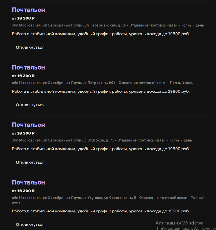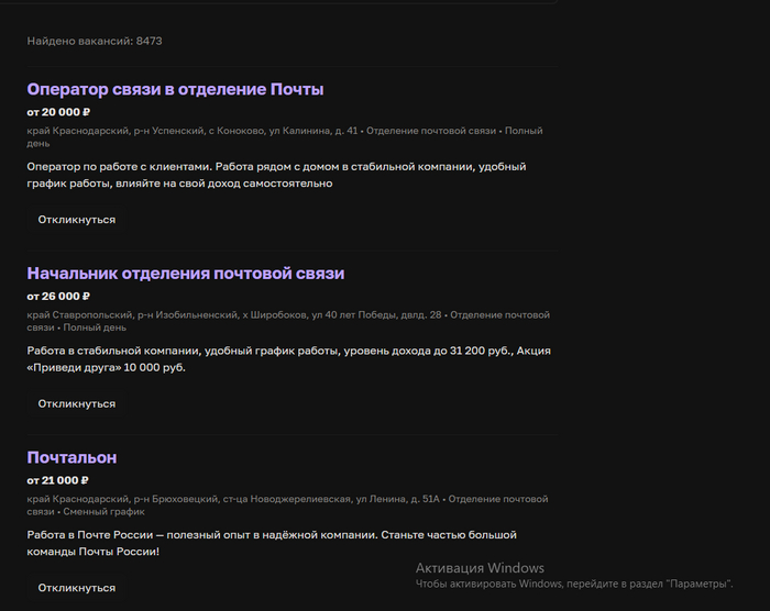 Теперь дело за Почтой России. Мне приложение недавно скинуло пуш с приглосом на работу. То что там были вакансии с приблизительно 7600р на полную ставку голословно утверждать не буду, ибо не скринил(читай ниже редакт). Но, даже 16к выдавать за "достойную зарплату" для нашего времени эт рил издевательство.