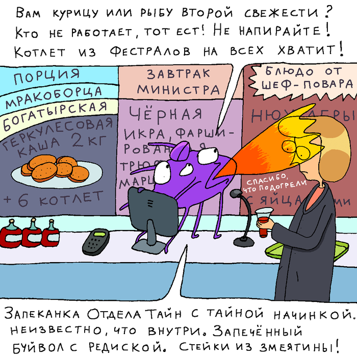 - Что я вижу! - воскликнула изумленная сотрудница Долорес А. - На раздаче пищи работает огнедышащий паук!