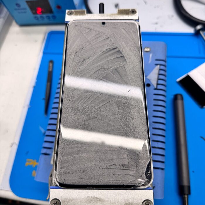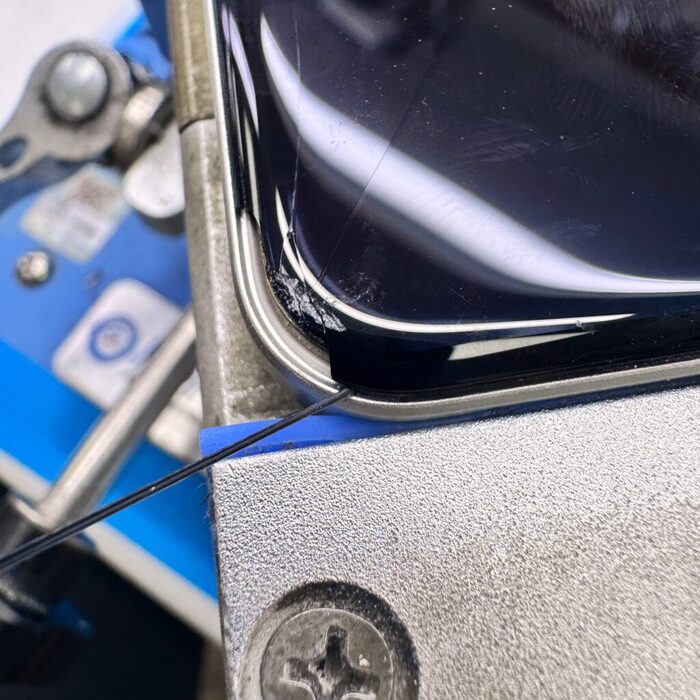 Закидываем дисплей на сепаратор, разбиваем углы алмазным диском и вытягиваем герметик.