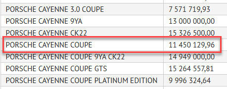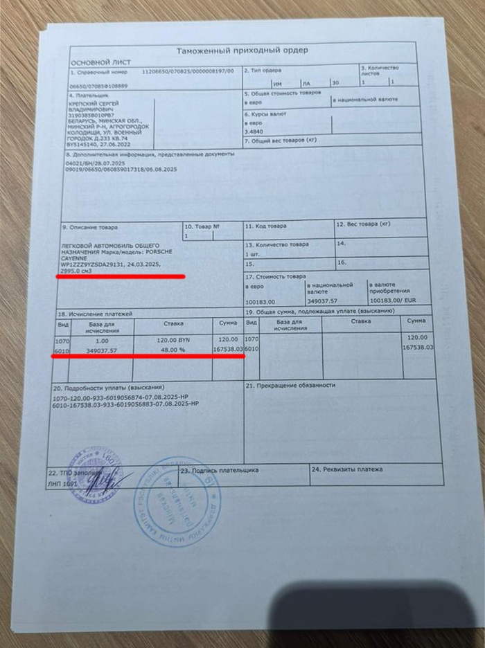 В поле 18 смотрим, какая была уплачена сумма таможенных платежей. По этой сумме вы сможете определить примерную стоимость автомобиля, которая была задекларирована при оформлении. Как правило, стоимость при оформлении занижается. Когда вы везете автомобиль на заказ, то вы знаете полную стоимость автомобиля и оплачиваете все таможенные платежи и пошлины, согласно стоимости автомобиля. Минпромторг уже не смотрит на инвойс (счет). Они берет в расчет рекомендуемую стоимость автомобиля из своего списка. Поэтому, если у нас по таможенному приходному ордеру (ТПО) стоимость автомобиля 100 183 евро, то согласно перечню Минпромторга, стоимость автомобиля Porsche Cayenne Coupe - 11 450 129 руб.