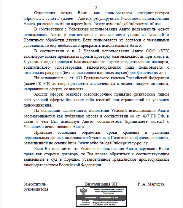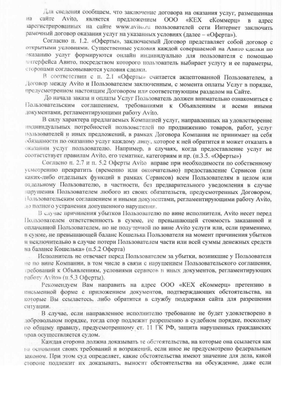 Как-то странно, на первой же странице, представитель РПН пишет, что Закон о защите прав потребителей определяет механизм реализации прав потребителя и в тоже время описывает , про акцепт оферы (правила, которые Авито меняет когда вздумается), снова описание пунктов правил площадки и отсутвие ссылок на ФЗ РФ, регламентирующие законность всех их правил.