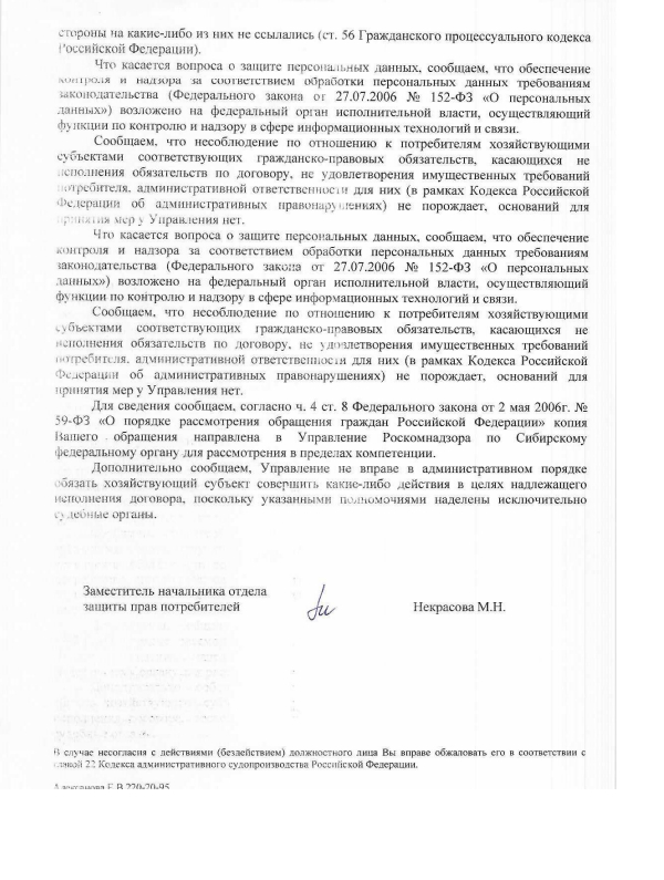 Ответ к вниманию приняла. На интересные соображения натолкнули использование в ответе ссылок на внутренние правила пользования интернет-площадки, помимо отсылки на норму закона о персональных данных. Во-первых, я писала вопрос не по вашей РКН компетенции, а в Роспотребнадзор по части защиты прав потребителей. Во-вторых, почему государственный орган описывает мне внутренние правила Авито, а не статьи и пункты ФЗ РФ, соответствующие заданному вопросу? кто тут главный, Авито это государство в государстве?
