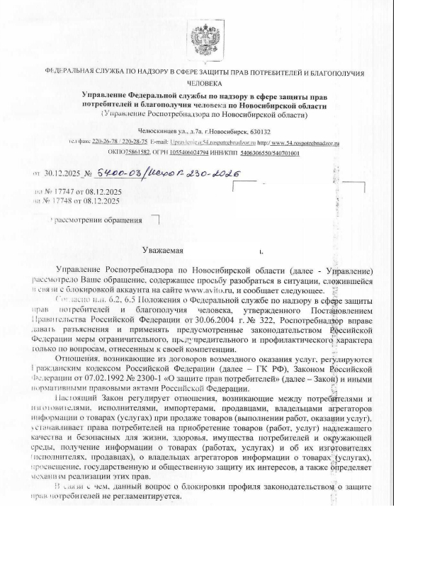 Ладно, убытки никакие я не несу, но как потребителя, Авито меня ограничивает в возможности покупать понравившийся мне товар без доступа в профиль. Если у Авито все чётко, значит, у меня остается вопрос к контролирующим органам. Написала вопрос в Роспотребнадзор, мол, так и так, Авито заблокировал мой профиль, однако это торговая площадка, я хочу купить товар, но не имею возможности, как и сами продавцы теряют потенциальных покупателей, разберитесь в вопросе. Жду ответ. Приходит через пару дней первое письмо от Роскомнадзора.