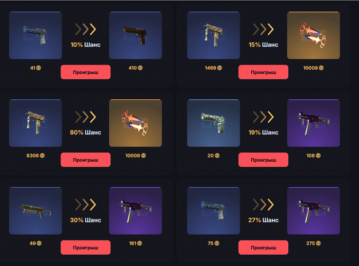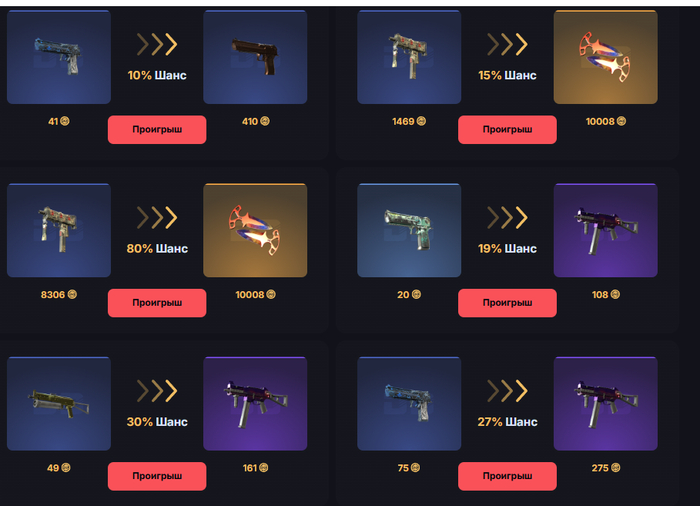 7 апгрейдов подряд с заявленными шансами 10–80% — все неудачные.